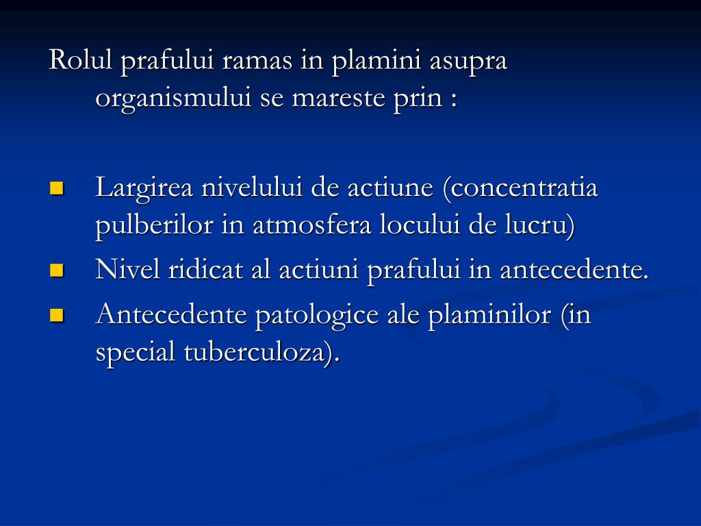 Rolul prafului ramas in plamini asupra organismului se mareste prin : • Largirea nivelului de actiune (concentratia pulberilor in atmosfera locului de lucru) • Nivel ridicat al actiuni prafului in antecedente. • Antecedente patologice ale plaminilor (in special tuberculoza).