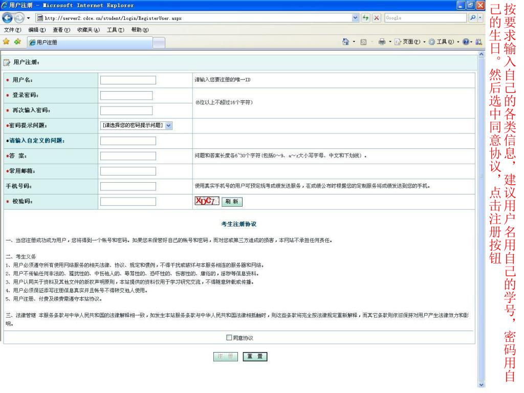 按要求输入自己的各类信息,建议用户名用自己的学号,密码用自己的生日。然后选中同意协议,点击注册按钮按要求输入自己的各类信息,建议用户名用自己的学号,密码用自己的生日。然后选中同意协议,点击注册按钮