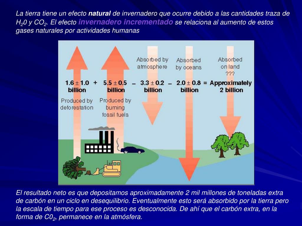 La tierra tiene un efecto natural de invernadero que ocurre debido a las cantidades traza de H20 y CO2. El efecto invernadero incrementado se relaciona al aumento de estos gases naturales por actividades humanas El resultado neto es que depositamos aproximadamente 2 mil millones de toneladas extra de carbón en un ciclo en desequilibrio. Eventualmente esto será absorbido por la tierra pero la escala de tiempo para ese proceso es desconocida. De ahí que el carbón extra, en la forma de C02, permanece en la atmósfera.