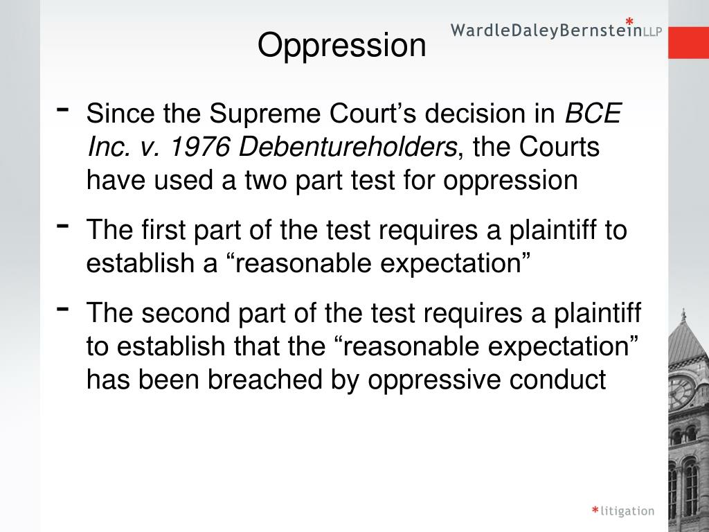 Oppression • Since the Supreme Court’s decision in BCE Inc. v. 1976 Debentureholders, the Courts have used a two part test for oppression • The first part of the test requires a plaintiff to establish a “reasonable expectation” • The second part of the test requires a plaintiff to establish that the “reasonable expectation” has been breached by oppressive conduct