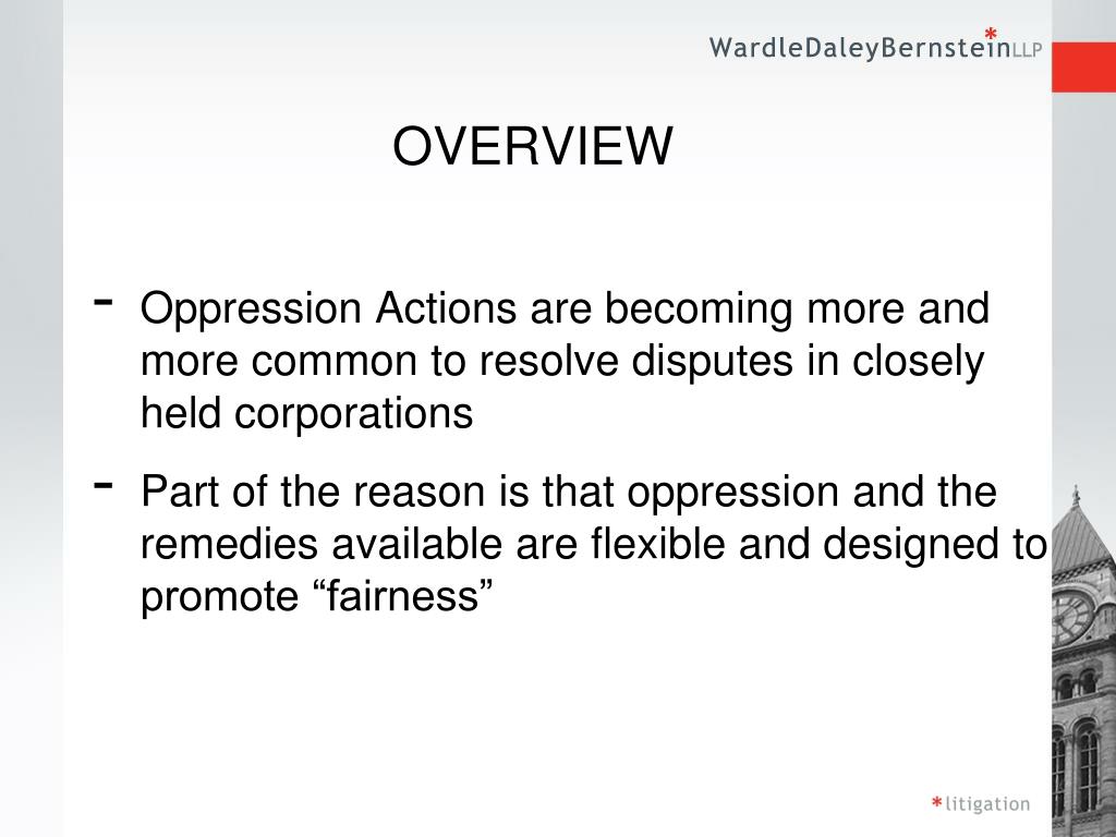 OVERVIEW • Oppression Actions are becoming more and more common to resolve disputes in closely held corporations • Part of the reason is that oppression and the remedies available are flexible and designed to promote “fairness”