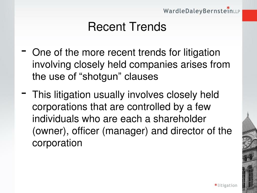 Recent Trends • One of the more recent trends for litigation involving closely held companies arises from the use of “shotgun” clauses • This litigation usually involves closely held corporations that are controlled by a few individuals who are each a shareholder (owner), officer (manager) and director of the corporation