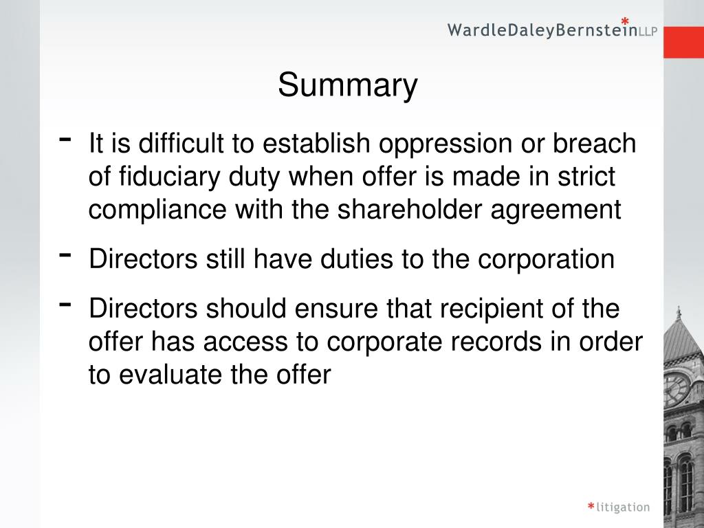 Summary • It is difficult to establish oppression or breach of fiduciary duty when offer is made in strict compliance with the shareholder agreement • Directors still have duties to the corporation • Directors should ensure that recipient of the offer has access to corporate records in order to evaluate the offer