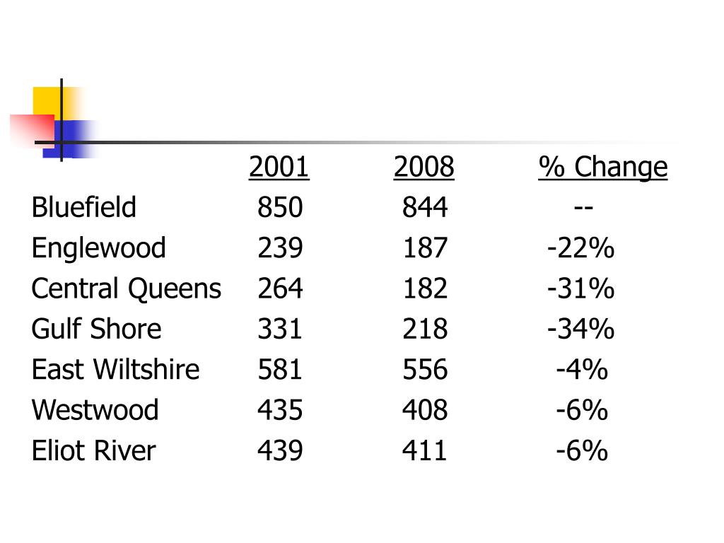 20012008% Change Bluefield 850 844 -- Englewood 239 187 -22% Central Queens 264 182 -31% Gulf Shore 331 218 -34% East Wiltshire 581 556 -4% Westwood 435 408 -6% Eliot River 439 411 -6%