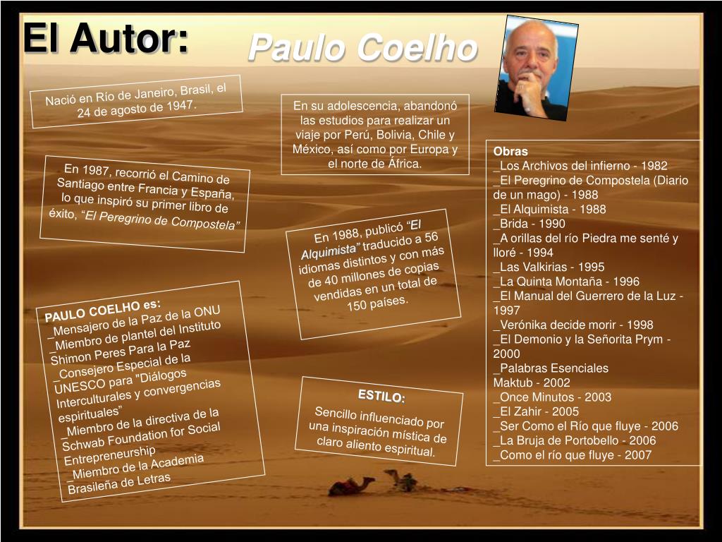 El Autor: Paulo Coelho Nació en Río de Janeiro, Brasil, el 24 de agosto de 1947. En su adolescencia, abandonó las estudios para realizar un viaje por Perú, Bolivia, Chile y México, así como por Europa y el norte de África. Obras _Los Archivos del infierno - 1982 _El Peregrino de Compostela (Diario de un mago) - 1988 _El Alquimista - 1988 _Brida - 1990 _A orillas del río Piedra me senté y lloré - 1994 _Las Valkirias - 1995 _La Quinta Montaña - 1996 _El Manual del Guerrero de la Luz - 1997 _Verónika decide morir - 1998 _El Demonio y la Señorita Prym - 2000 _Palabras Esenciales Maktub - 2002 _Once Minutos - 2003 _El Zahir - 2005 _Ser Como el Río que fluye - 2006 _La Bruja de Portobello - 2006 _Como el río que fluye - 2007 En 1987, recorrió el Camino de Santiago entre Francia y España, lo que inspiró su primer libro de éxito, “El Peregrino de Compostela” En 1988, publicó“El Alquimista” traducido a 56 idiomas distintos y con más de 40 millones de copias vendidas en un total de 150 países. PAULO COELHO es: _Mensajero de la Paz de la ONU _Miembro de plantel del Instituto Shimon Peres Para la Paz _Consejero Especial de la UNESCO para "Diálogos Interculturales y convergencias espirituales” _Miembro de la directiva de la Schwab Foundation for Social Entrepreneurship _Miembro de la Academia Brasileña de Letras ESTILO: Sencillo influenciado por una inspiración mística de claro aliento espiritual.