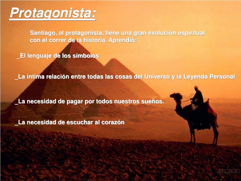 Protagonista: Santiago, el protagonista, tiene una gran evolución espiritual con el correr de la historia. Aprendió: _El lenguaje de los símbolos _La íntima relación entre todas las cosas del Universo y la Leyenda Personal _La necesidad de pagar por todos nuestros sueños. _La necesidad de escuchar al corazón