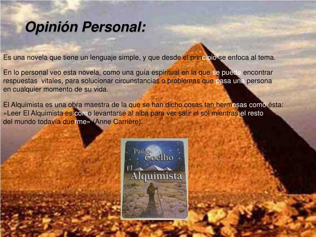 Opinión Personal: Es una novela que tiene un lenguaje simple, y que desde el principio se enfoca al tema. En lo personal veo esta novela, como una guía espiritual en la que se puede encontrar respuestas vitales, para solucionar circunstancias o problemas que pasa una persona en cualquier momento de su vida. El Alquimista es una obra maestra de la que se han dicho cosas tan hermosas como ésta: «Leer El Alquimista es como levantarse al alba para ver salir el sol mientras el resto del mundo todavía duerme» (Anne Carrière).