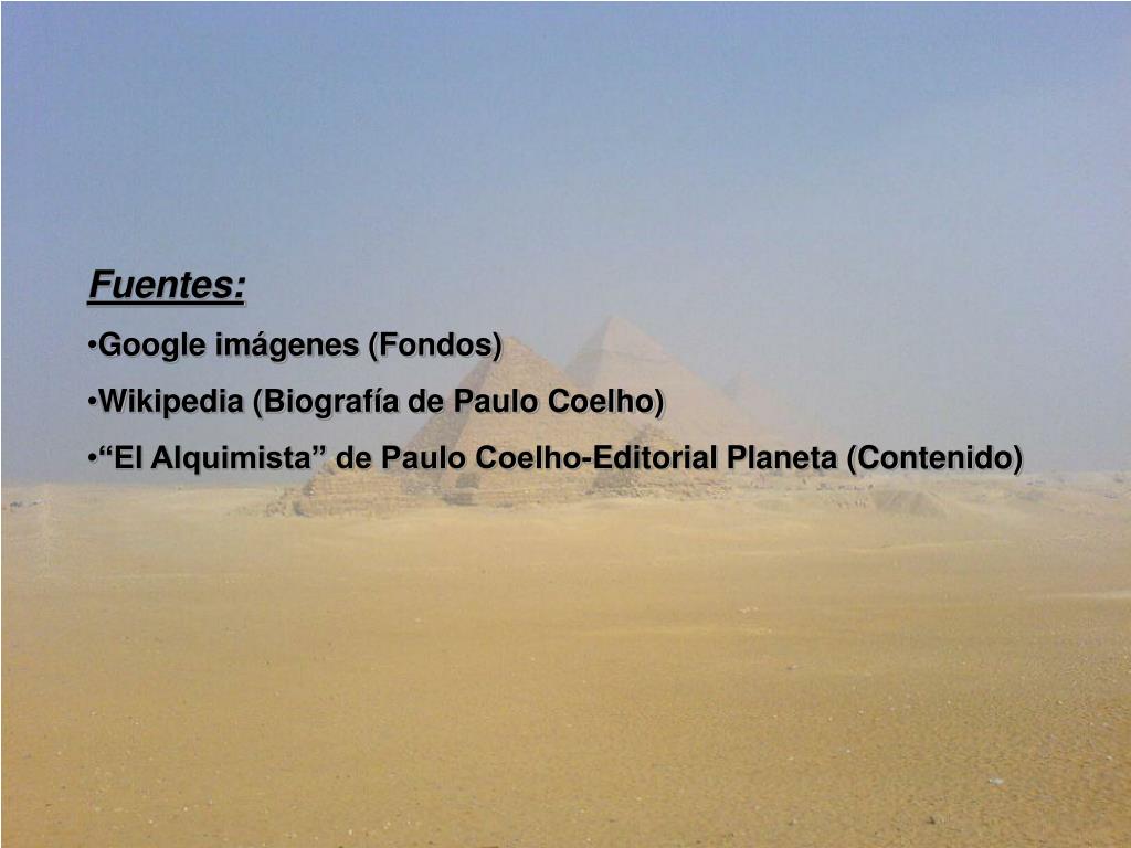 Fuentes: • Google imágenes (Fondos) • Wikipedia (Biografía de Paulo Coelho) • “El Alquimista” de Paulo Coelho-Editorial Planeta (Contenido)