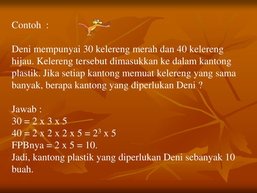 Contoh : Deni mempunyai 30 kelereng merah dan 40 kelereng hijau. Kelereng tersebut dimasukkan ke dalam kantong plastik. Jika setiap kantong memuat kelereng yang sama banyak, berapa kantong yang diperlukan Deni ? Jawab : 30 = 2 x 3 x 5 40 = 2 x 2 x 2 x 5 = 23 x 5 FPBnya = 2 x 5 = 10. Jadi, kantong plastik yang diperlukan Deni sebanyak 10 buah.
