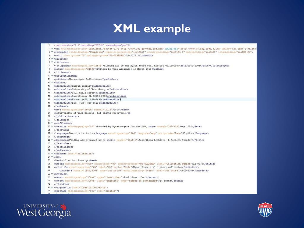 EAD EAD is represented in XML (Extensible Markup Language), a platform-neutral data format that ensures data longevity when migrating from one software environment to another.