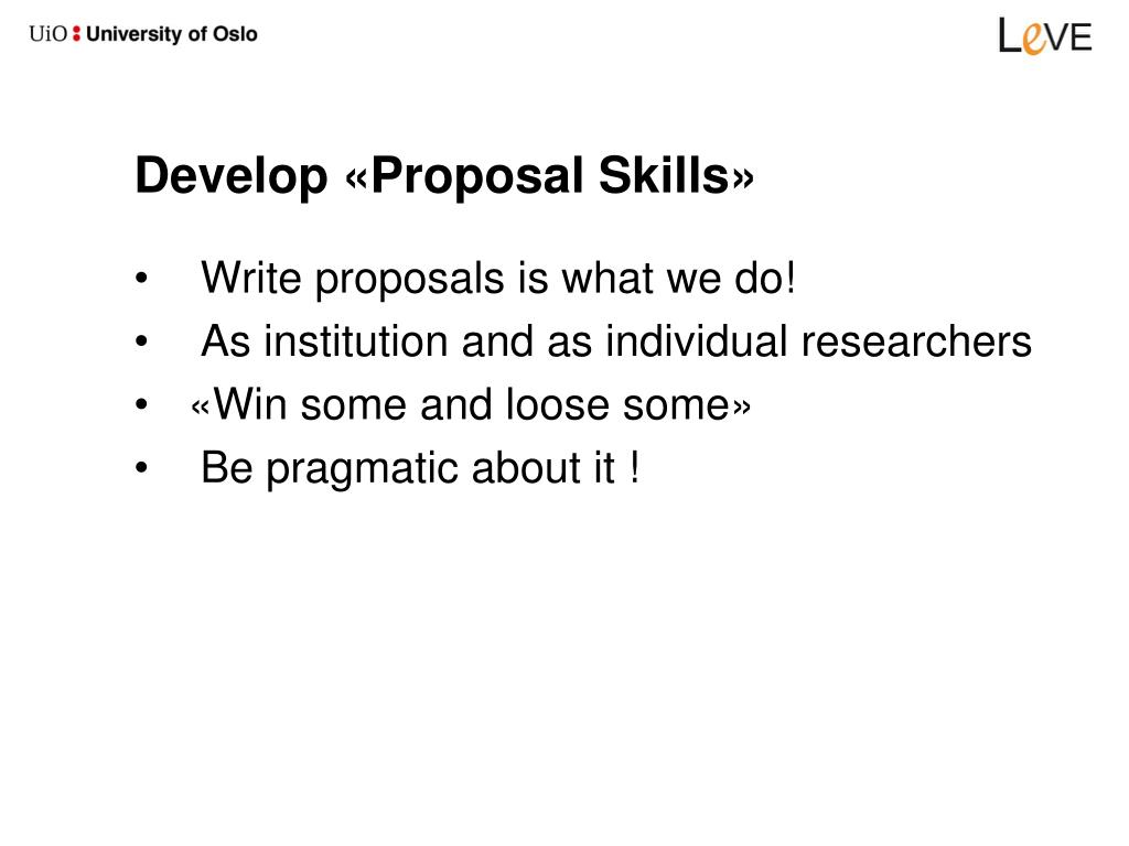 Develop «Proposal Skills» • Write proposals is what we do! • As institution and as individual researchers • «Win some and loose some» • Be pragmatic about it !
