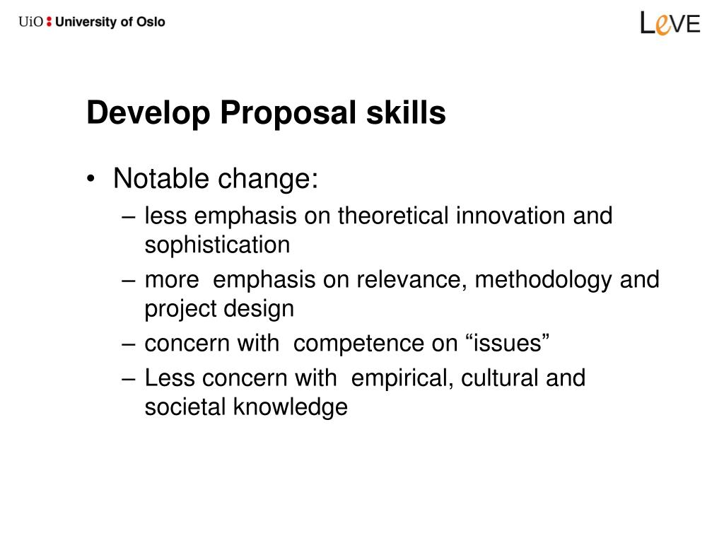 DevelopProposal skills • Notable change: • less emphasis on theoretical innovation and sophistication • more emphasis on relevance, methodology and project design • concern with competence on “issues” • Less concern with empirical, cultural and societal knowledge