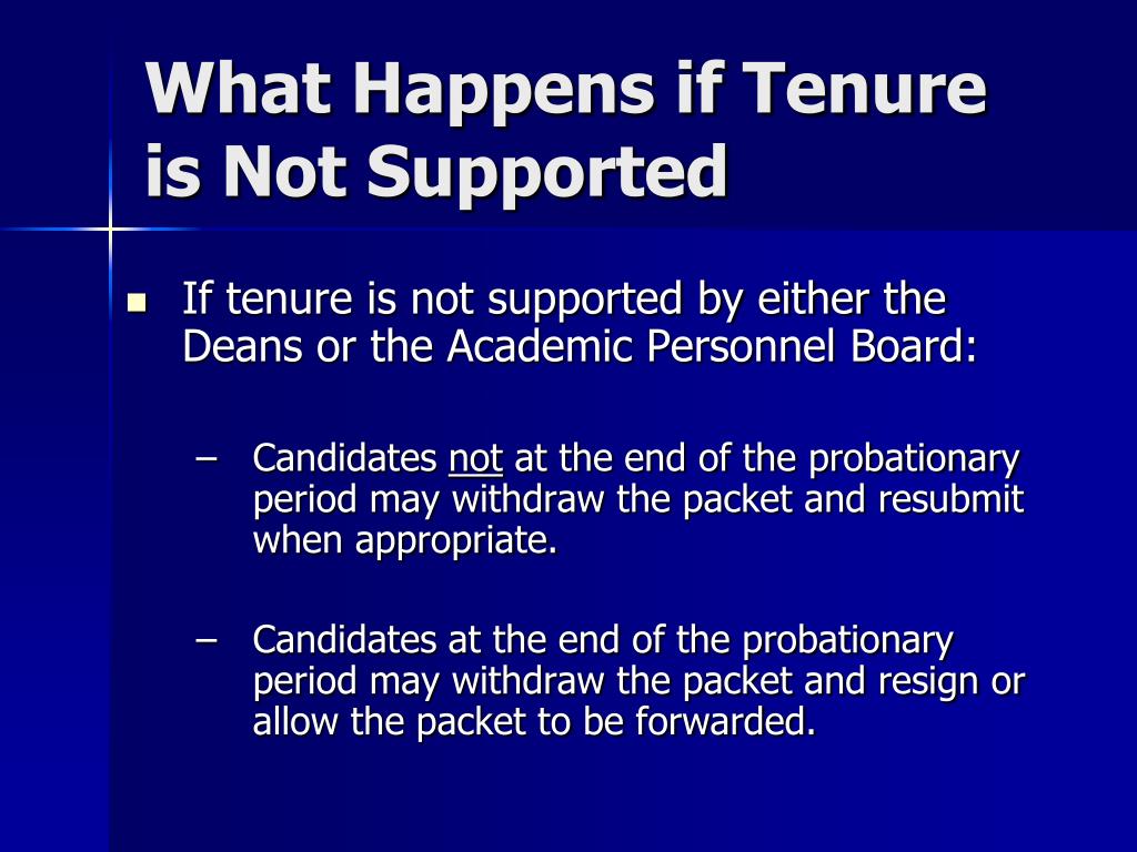 What Happens if Tenure is Not Supported • If tenure is not supported by either the Deans or the Academic Personnel Board: • Candidates not at the end of the probationary period may withdraw the packet and resubmit when appropriate. • Candidates at the end of the probationary period may withdraw the packet and resign or allow the packet to be forwarded.