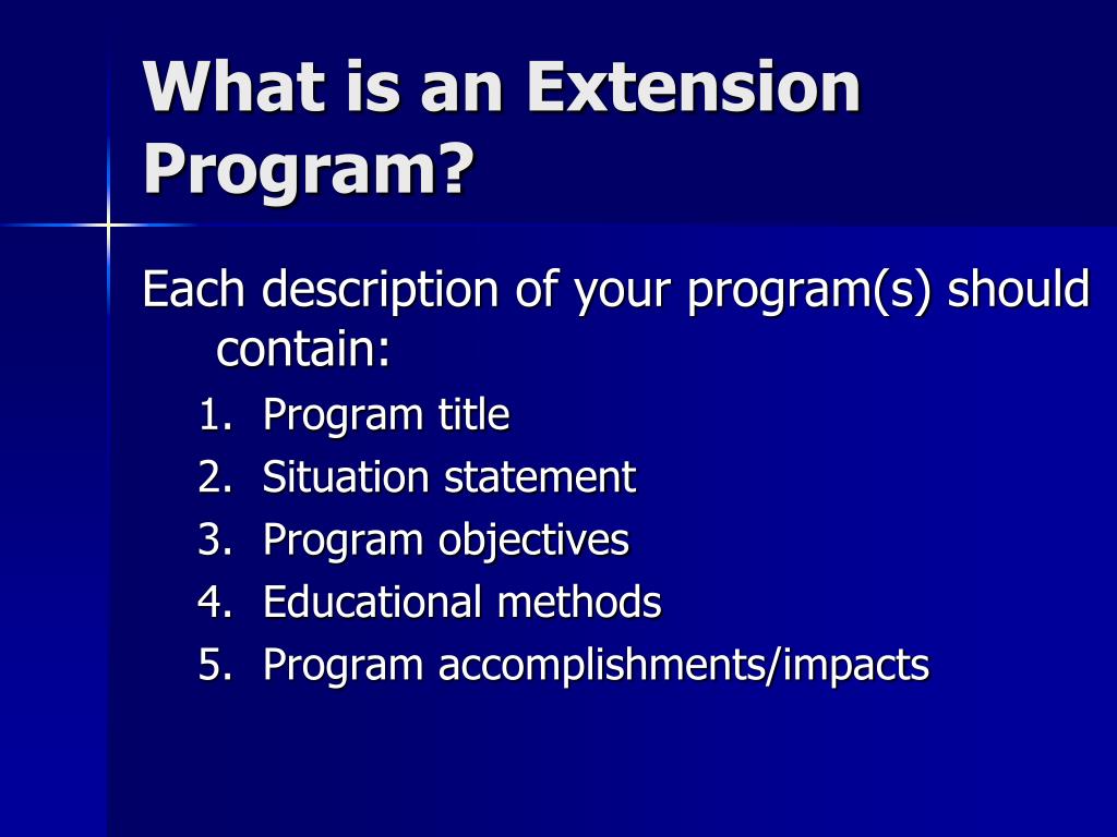 What is an Extension Program? Each description of your program(s) should contain: • Program title • Situation statement • Program objectives • Educational methods • Program accomplishments/impacts