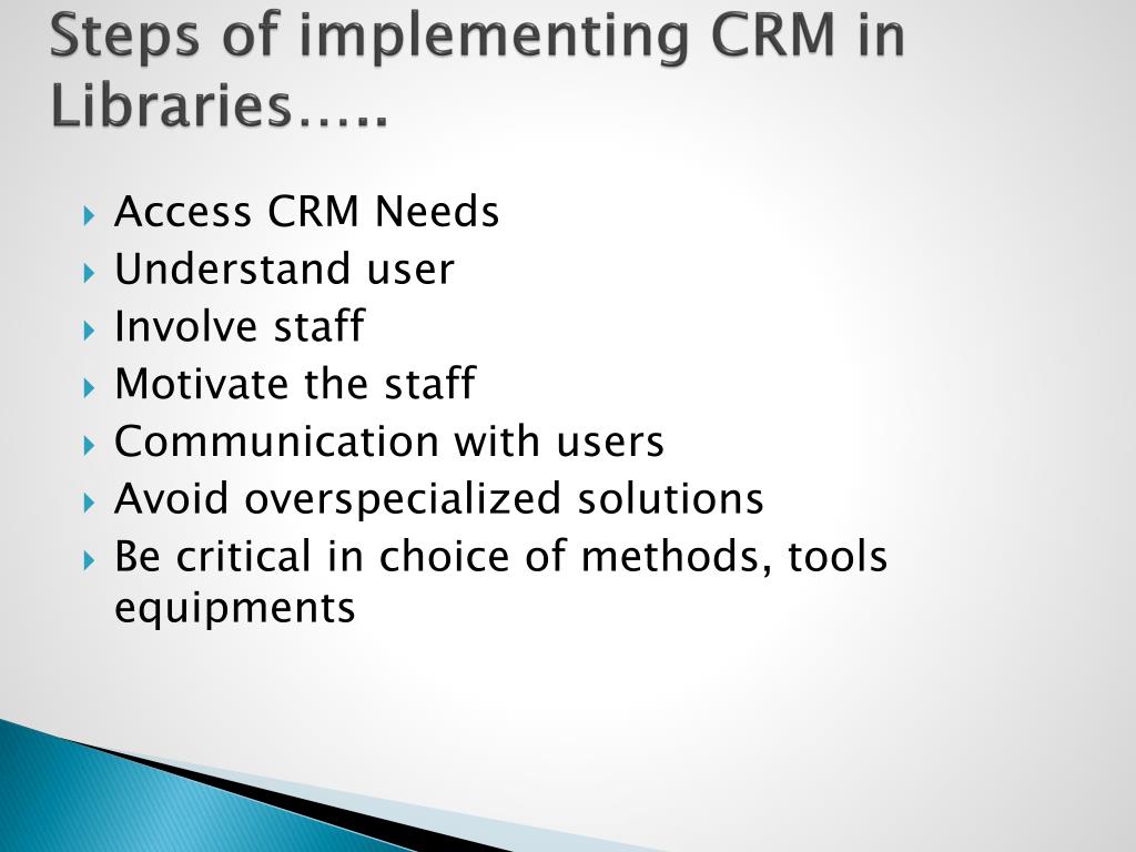 Steps of implementing CRM in Libraries….. • Access CRM Needs • Understand user • Involve staff • Motivate the staff • Communication with users • Avoid overspecialized solutions • Be critical in choice of methods, tools equipments