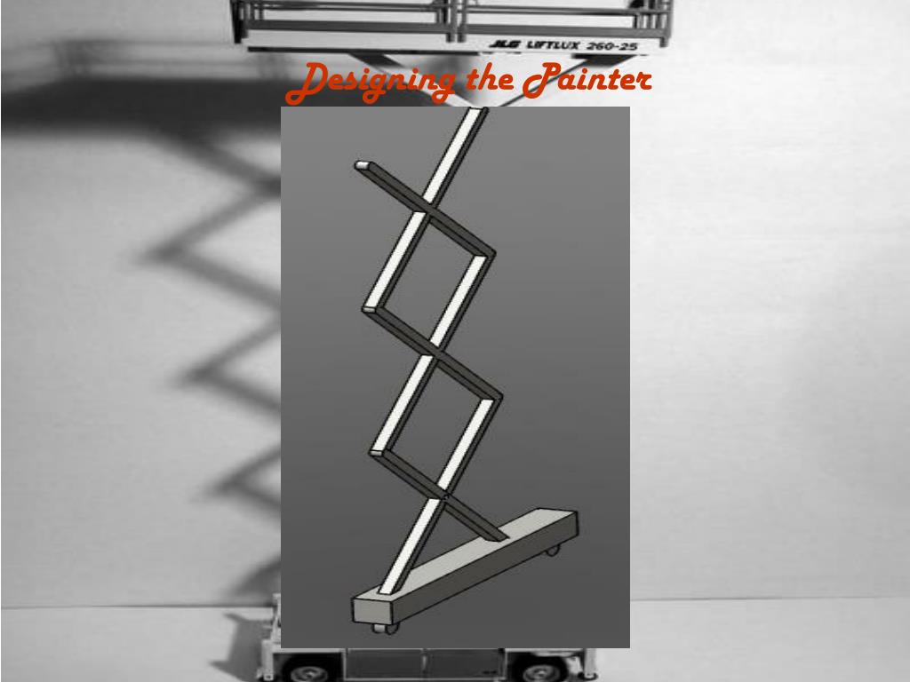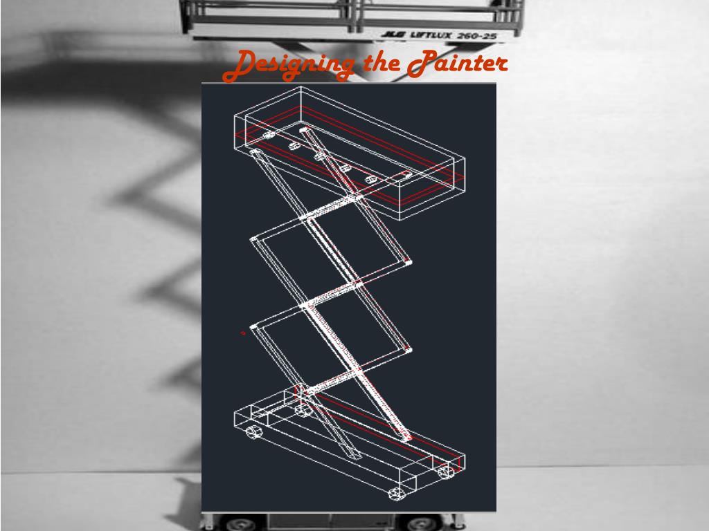 The Solution • I chose to design an automatic wall painter that couldoperate using electronic components and a hydraulic lifting/lowering system. • I combined a hydraulic elevator platform and an aerosol-operated inkjet printer system to designa mechanism that, if constructed, would go up and down and across walls, speedily and accurately painting as it moved.