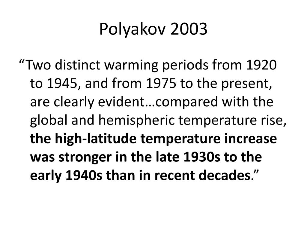 Polyakov 2003 “Two distinct warming periods from 1920 to 1945, and from 1975 to the present, are clearly evident…compared with the global and hemispheric temperature rise, the high-latitude temperature increase was stronger in the late 1930s to the early 1940s than in recent decades.”