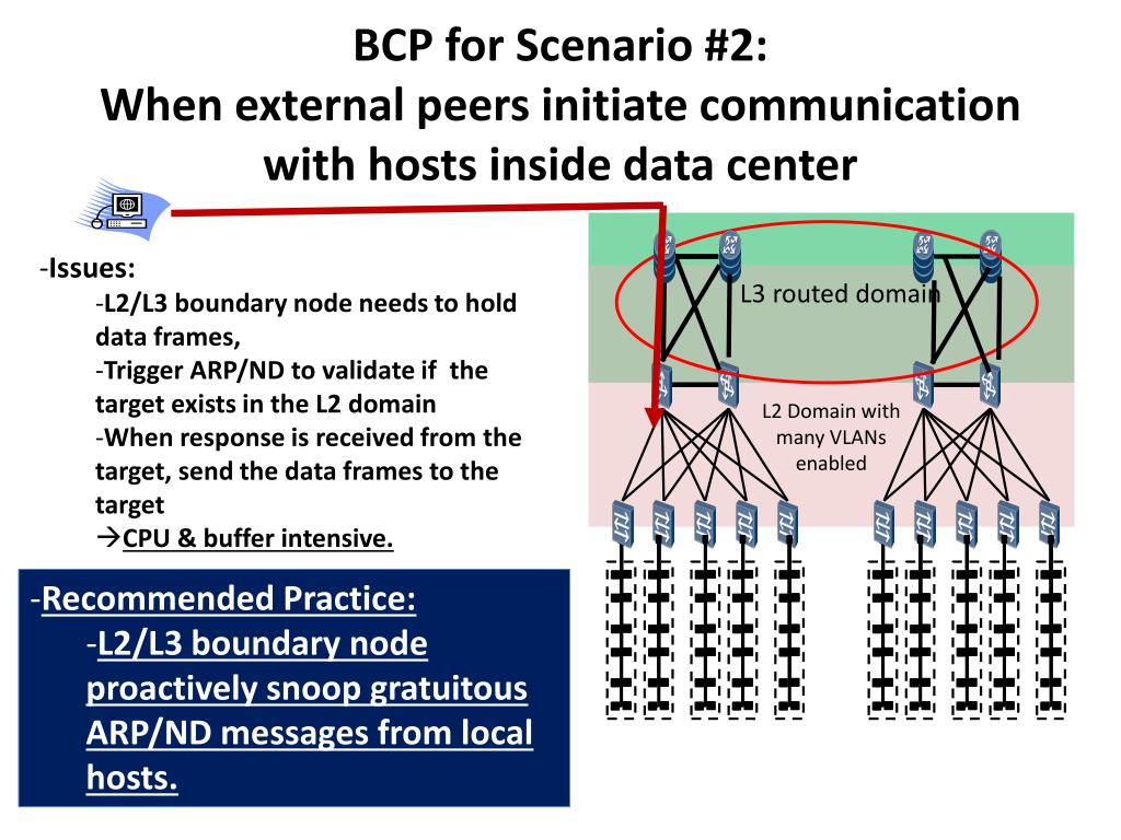 BCP for Scenario #2: When external peers initiate communication with hosts inside data center • Issues: • L2/L3 boundary node needs to hold data frames, • Trigger ARP/ND to validate if the target exists in the L2 domain • When response is received from the target, send the data frames to the target • CPU & buffer intensive. L3 routed domain L2 Domain with many VLANs enabled • Recommended Practice: • L2/L3 boundary node proactively snoop gratuitous ARP/ND messages from local hosts.