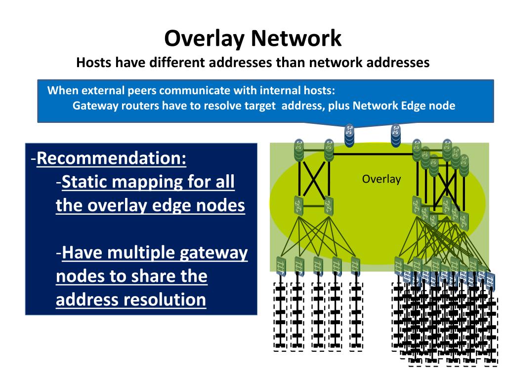 Overlay NetworkHosts have different addresses than network addresses • When external peers communicate with internal hosts: • Gateway routers have to resolve target address, plus Network Edge node • Recommendation: • Static mapping for all the overlay edge nodes • Have multiple gateway nodes to share the address resolution Overlay