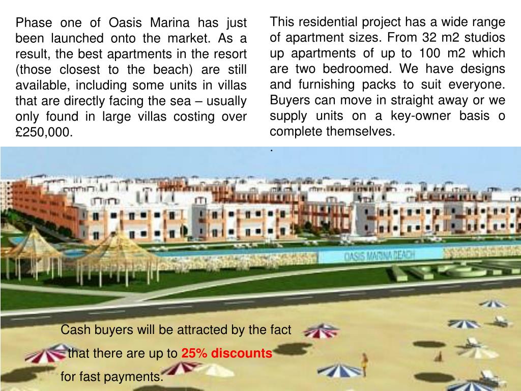 This residential project has a wide range of apartment sizes. From 32 m2 studios up apartments of upto 100 m2 which are two bedroomed. We have designs and furnishing packs to suit everyone. Buyers can move in straight away or we supply units on a key-owner basis o complete themselves. . Phase one of Oasis Marina has just been launched onto the market. As a result, the best apartments in the resort (those closest to the beach) are still available, including some units in villas that are directly facing the sea – usually only found in large villas costing over £250,000. Cash buyers will be attracted by the fact that there are up to 25% discounts for fast payments.