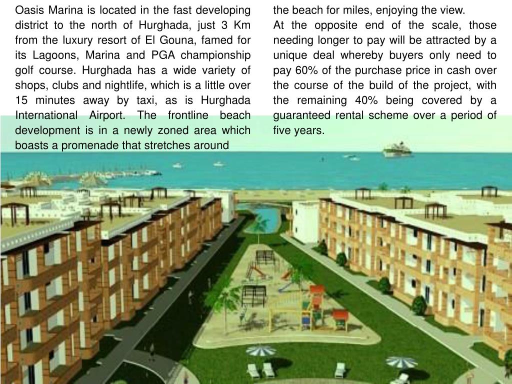 Oasis Marina is located in the fast developing district to the north of Hurghada, just 3 Km from the luxury resort of El Gouna, famed for its Lagoons, Marina and PGA championship golf course. Hurghada has a wide variety of shops, clubs and nightlife, which is a little over 15 minutes away by taxi, as is Hurghada International Airport. The frontline beach development is in a newly zoned area which boasts a promenade that stretches around the beach for miles, enjoying the view. At the opposite end of the scale, those needing longer to pay will be attracted by a unique deal whereby buyers only need to pay 60% of the purchase price in cash over the course of the build of the project, with the remaining 40% being covered by a guaranteed rental scheme over a period of five years.