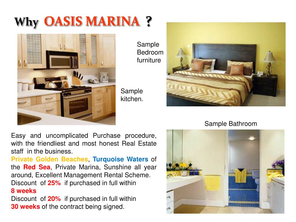 Why OASIS MARINA ? Sample Bedroom furniture Sample kitchen. Easy and uncomplicated Purchase procedure, with the friendliest and most honest Real Estate staff in the business. Private Golden Beaches, Turquoise Waters of the Red Sea, Private Marina, Sunshine all year around, Excellent Management Rental Scheme. Discount of 25% if purchased in full within 8 weeks Discount of 20% if purchased in full within 30 weeks of the contract being signed. Sample Bathroom