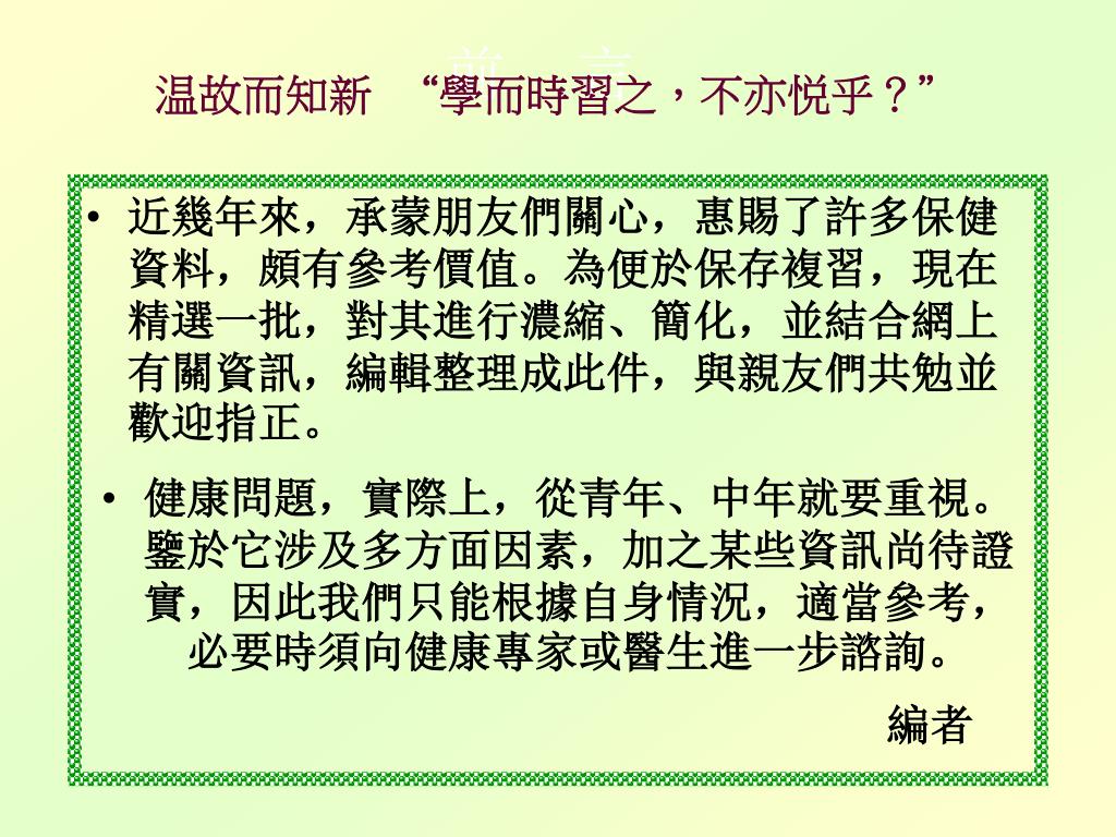 前 言 温故而知新 “學而時習之,不亦悦乎?” • 近幾年來,承蒙朋友們關心,惠賜了許多保健資料,頗有參考價值。為便於保存複習,現在精選一批,對其進行濃縮、簡化,並結合網上有關資訊,編輯整理成此件,與親友們共勉並歡迎指正。 • 健康問題,實際上,從青年、中年就要重視。鑒於它涉及多方面因素,加之某些資訊尚待證實,因此我們只能根據自身情況,適當參考,必要時須向健康專家或醫生進一步諮詢。 編者
