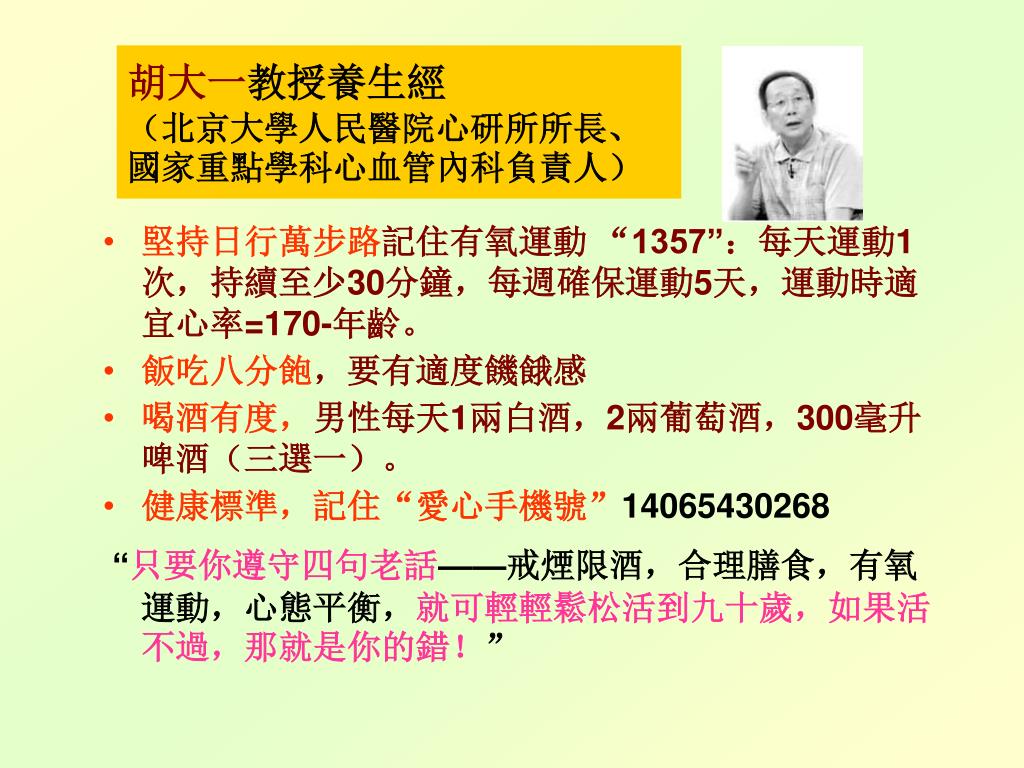 胡大一教授養生經(北京大學人民醫院心研所所長、國家重點學科心血管內科負責人)胡大一教授養生經(北京大學人民醫院心研所所長、國家重點學科心血管內科負責人) • 堅持日行萬步路記住有氧運動 “1357”:每天運動1次,持續至少30分鐘,每週確保運動5天,運動時適宜心率=170-年齡。 • 飯吃八分飽,要有適度饑餓感 • 喝酒有度,男性每天1兩白酒,2兩葡萄酒,300毫升啤酒(三選一)。 • 健康標準,記住“愛心手機號”14065430268 “只要你遵守四句老話——戒煙限酒,合理膳食,有氧運動,心態平衡,就可輕輕鬆松活到九十歲,如果活不過,那就是你的錯!”