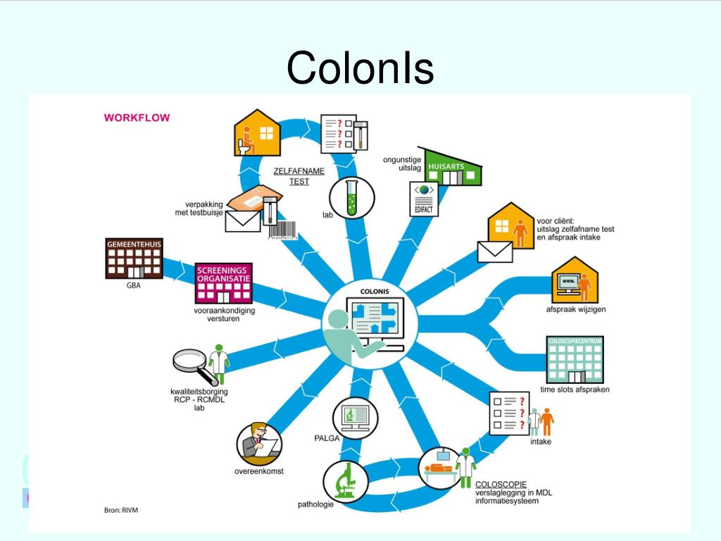 ICT ondersteunt screening, borging en evaluatie • Zo weinig mogelijk handmatige invoer • Cliëntenportal • Toetsing en auditing colonoscopiecentra • Landelijk afsprakenpunt • Koppeling MDL systeem