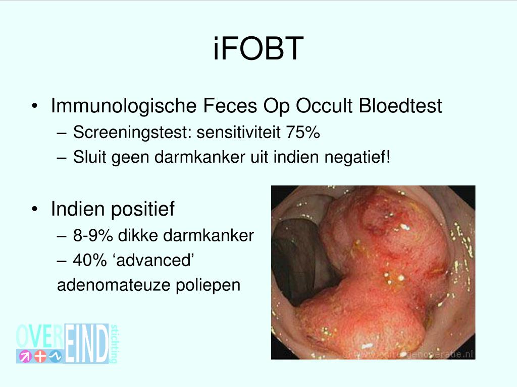 iFOBT • Immunologische Feces Op Occult Bloedtest • Screeningstest: sensitiviteit 75% • Sluit geen darmkanker uit indien negatief! • Indien positief • 8-9% dikke darmkanker • 40% ‘advanced’ adenomateuze poliepen