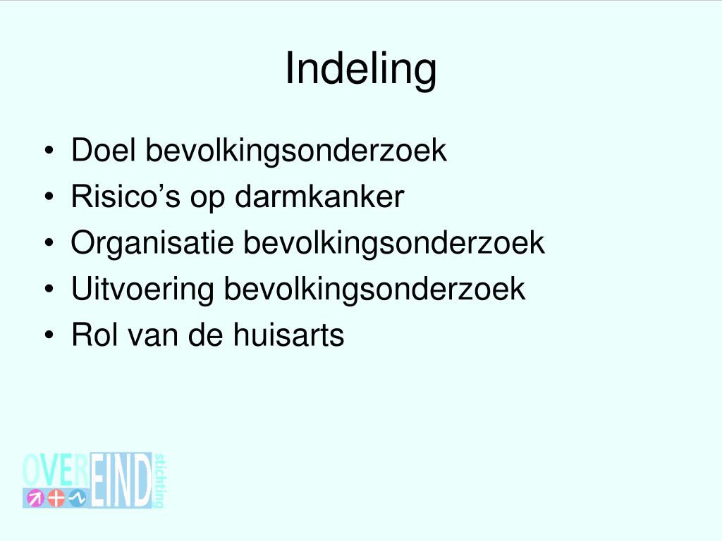 Indeling • Doel bevolkingsonderzoek • Risico’s op darmkanker • Organisatie bevolkingsonderzoek • Uitvoering bevolkingsonderzoek • Rol van de huisarts