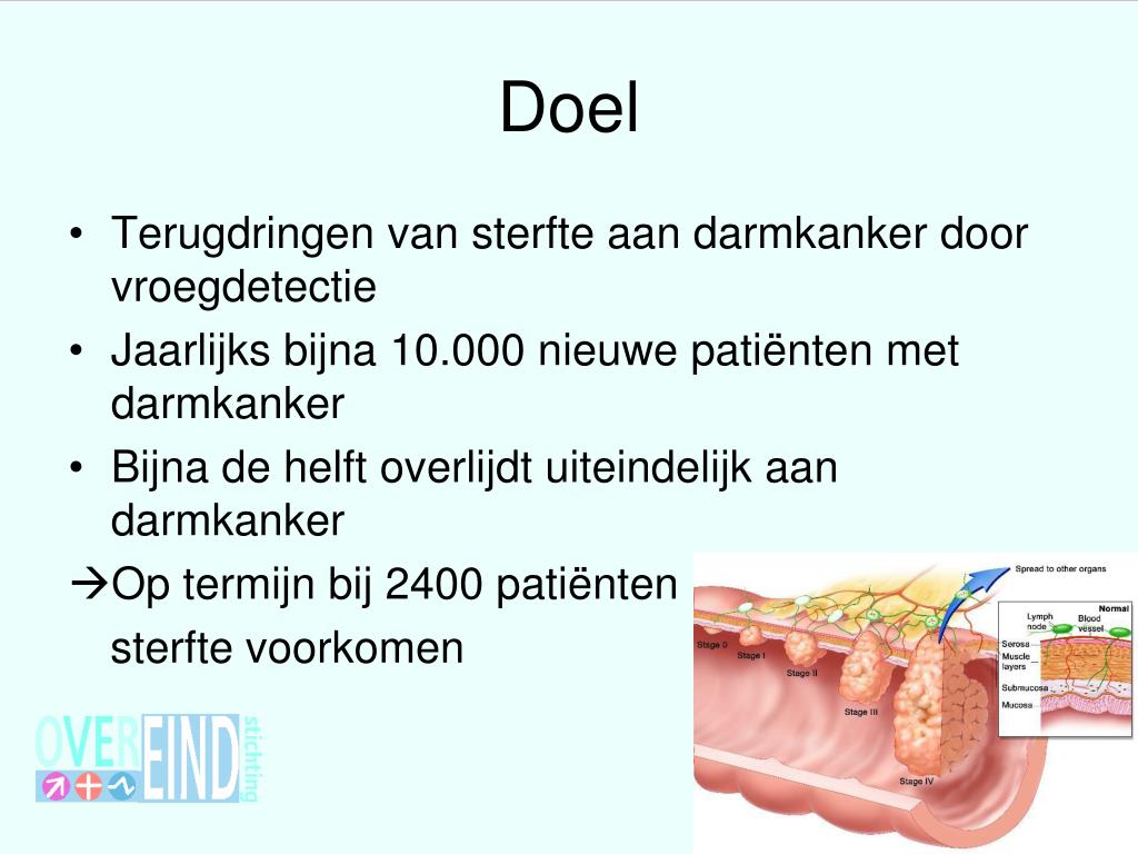Doel • Terugdringen van sterfte aan darmkanker door vroegdetectie • Jaarlijks bijna 10.000 nieuwe patiënten met darmkanker • Bijna de helft overlijdt uiteindelijk aan darmkanker • Op termijn bij 2400 patiënten sterfte voorkomen