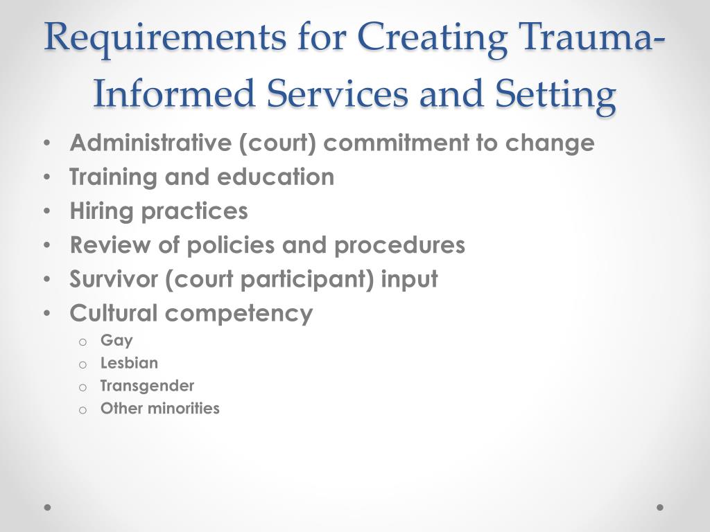 Requirements for Creating Trauma-Informed Services and Setting • Administrative (court) commitment to change • Training and education • Hiring practices • Review of policies and procedures • Survivor (court participant) input • Cultural competency • Gay • Lesbian • Transgender • Other minorities