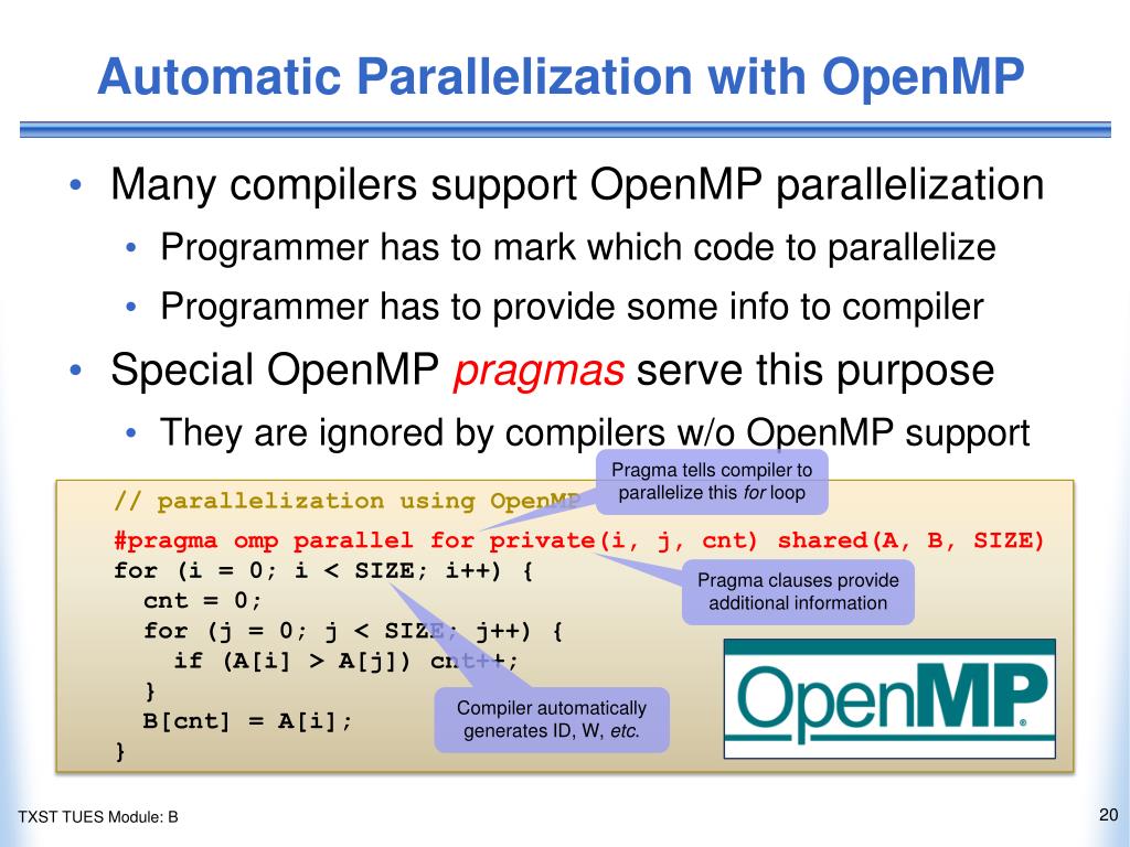 Automatic Parallelization with OpenMP Pragma tells compiler to parallelize this for loop // parallelization using OpenMP #pragma omp parallel for private(i, j, cnt) shared(A, B, SIZE) for (i = 0; i < SIZE; i++) { cnt = 0; for (j = 0; j < SIZE; j++) { if (A[i] > A[j]) cnt++; } B[cnt] = A[i]; } Pragma clauses provide additional information Compiler automatically generates ID, W, etc. • Many compilers support OpenMP parallelization • Programmer has to mark which code to parallelize • Programmer has to provide some info to compiler • Special OpenMP pragmas serve this purpose • They are ignored by compilers w/o OpenMP support