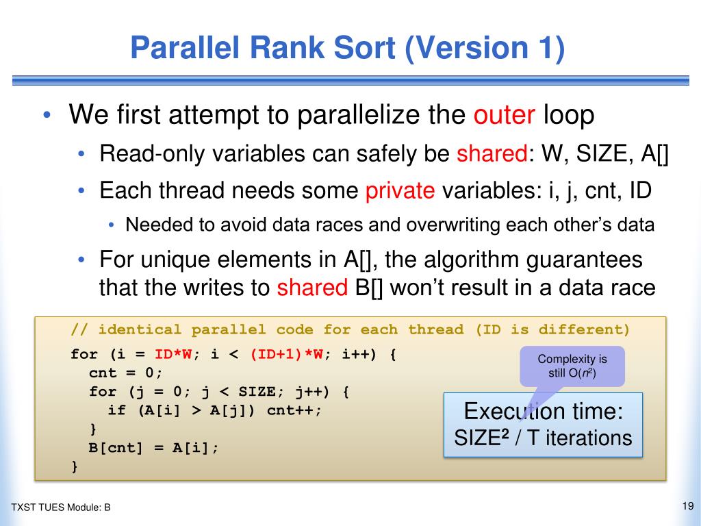 Parallel Rank Sort (Version 1) // identical parallel code for each thread (ID is different) for (i = ID*W; i < (ID+1)*W; i++) { cnt = 0; for (j = 0; j < SIZE; j++) { if (A[i] > A[j]) cnt++; } B[cnt] = A[i]; } Complexity is still O(n2) Execution time: SIZE2 / T iterations • We first attempt to parallelize the outer loop • Read-only variables can safely be shared: W, SIZE, A[] • Each thread needs some private variables: i, j, cnt, ID • Needed to avoid data races and overwriting each other’s data • For unique elements in A[], the algorithm guarantees that the writes to shared B[] won’t result in a data race