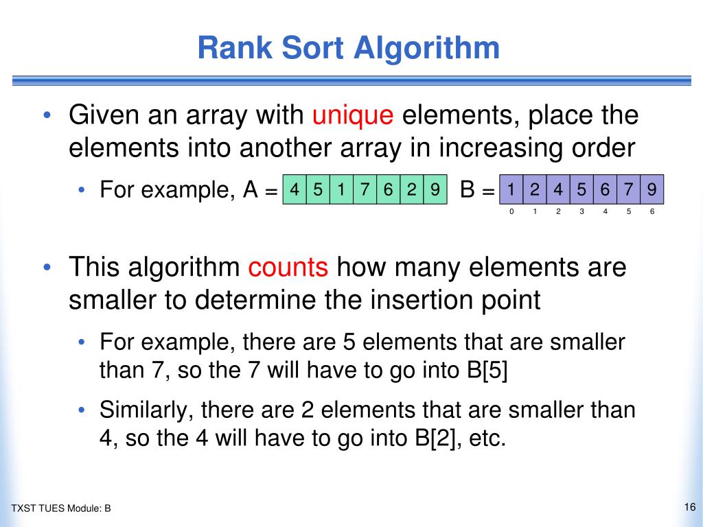 Rank Sort Algorithm 4 5 1 7 6 2 9 1 2 4 5 6 7 9 0 1 2 3 4 5 6 • Given an array with unique elements, place the elements into another array in increasing order • For example, A = B = • This algorithm counts how many elements are smaller to determine the insertion point • For example, there are 5 elements that are smaller than 7, so the 7 will have to go into B[5] • Similarly, there are 2 elements that are smaller than 4, so the 4 will have to go into B[2], etc.