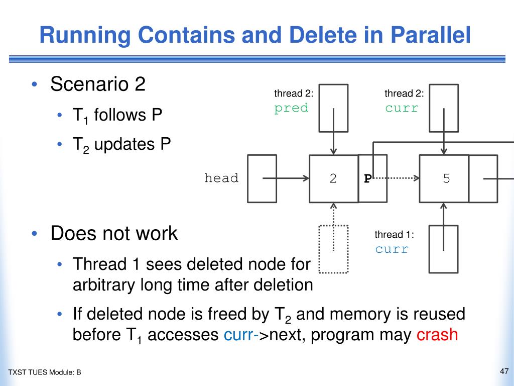 Running Contains and Delete in Parallel thread 2: pred thread 2: curr head 2 P 5 thread 1: curr • Scenario 2 • T1 follows P • T2 updates P • Does not work • Thread 1 sees deleted node forarbitrary long time after deletion • If deleted node is freed by T2 and memory is reused before T1 accesses curr->next, program may crash