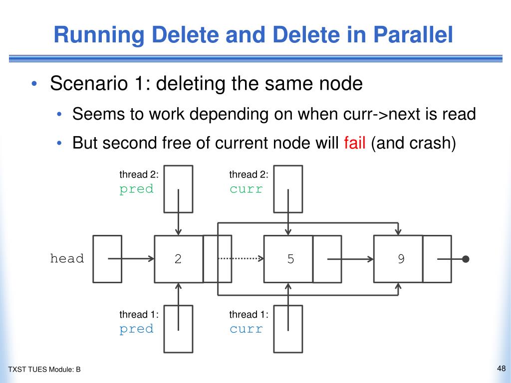 Running Delete and Delete in Parallel thread 2: pred thread 2: curr head 2 5 9 thread 1: pred thread 1: curr • Scenario 1: deleting the same node • Seems to work depending on when curr->next is read • But second free of current node will fail (and crash)