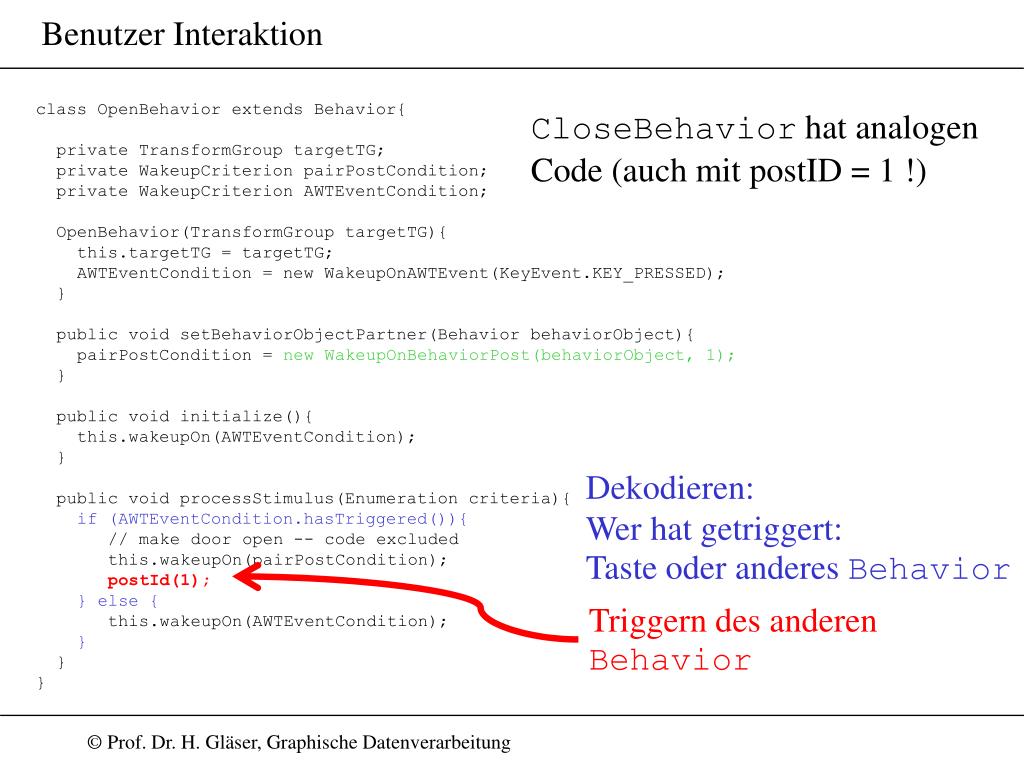 class OpenBehavior extends Behavior{ private TransformGroup targetTG; private WakeupCriterion pairPostCondition; private WakeupCriterion AWTEventCondition; OpenBehavior(TransformGroup targetTG){ this.targetTG = targetTG; AWTEventCondition = new WakeupOnAWTEvent(KeyEvent.KEY_PRESSED); } public void setBehaviorObjectPartner(Behavior behaviorObject){ pairPostCondition = new WakeupOnBehaviorPost(behaviorObject, 1); } public void initialize(){ this.wakeupOn(AWTEventCondition); } public void processStimulus(Enumeration criteria){ if (AWTEventCondition.hasTriggered()){ // make door open -- code excluded this.wakeupOn(pairPostCondition); postId(1); } else { this.wakeupOn(AWTEventCondition); } } } CloseBehavior hat analogen Code (auch mit postID = 1 !) Dekodieren: Wer hat getriggert: Taste oder anderes Behavior Triggern des anderen Behavior