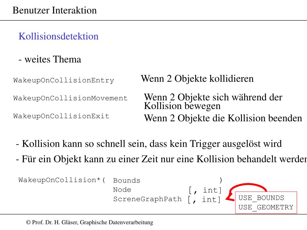 Kollisionsdetektion - weites Thema Wenn 2 Objekte kollidieren WakeupOnCollisionEntry WakeupOnCollisionMovement Wenn 2 Objekte sich während der Kollision bewegen WakeupOnCollisionExit Wenn 2 Objekte die Kollision beenden - Kollision kann so schnell sein, dass kein Trigger ausgelöst wird - Für ein Objekt kann zu einer Zeit nur eine Kollision behandelt werden ) WakeupOnCollision*( Bounds Node ScreneGraphPath [, int] [, USE_BOUNDS USE_GEOMETRY int]