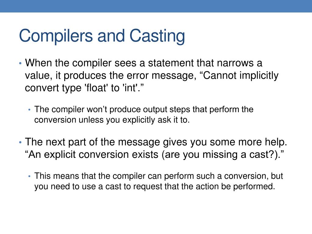 Compilers and Casting • When the compiler sees a statement that narrows a value, it produces the error message, “Cannot implicitly convert type 'float' to 'int'.” • The compiler won’t produce output steps that perform the conversion unless you explicitly ask it to. • The next part of the message gives you some more help. “An explicit conversion exists (are you missing a cast?).” • This means that the compiler can perform such a conversion, but you need to use a cast to request that the action be performed.