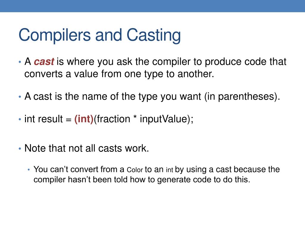 Compilers and Casting • A castis where you ask the compiler to produce code that converts a value from one type to another. • A cast is the name of the type you want (in parentheses). • int result = (int)(fraction * inputValue); • Note that not all casts work. • You can’t convert from a Color to an intby using a cast because the compiler hasn’t been told how to generate code to do this.