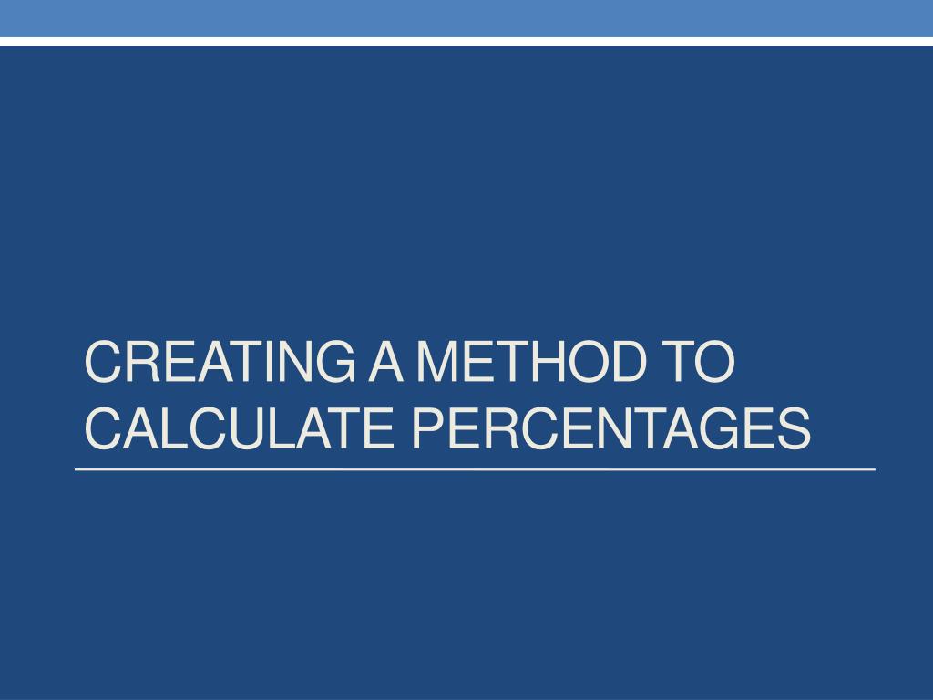 Creating the getPercentageMethod Body • Algorithm • Calculate the fraction of the amount that you want (this is the percentage divided by 100; in other words, 50 percent would give you 50/100, which is a half). • Multiply the incoming amount by this fraction to create the result. • Code intgetPercentage(int percentage, intinputValue) { intfraction = percentage / 100; intresult = fraction * inputValue; return result; }