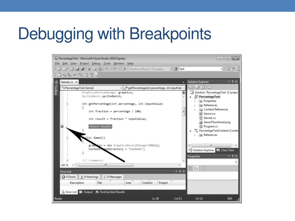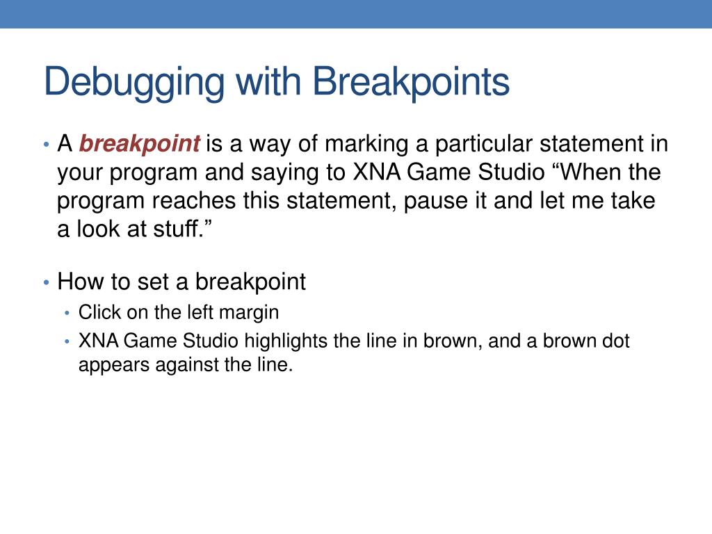 Debugging with Breakpoints • A breakpointis a way of marking a particular statement in your program and saying to XNA Game Studio “When the program reaches this statement, pause it and let me take a look at stuff.” • How to set a breakpoint • Click on the left margin • XNA Game Studio highlights the line in brown, and a brown dot appears against the line.