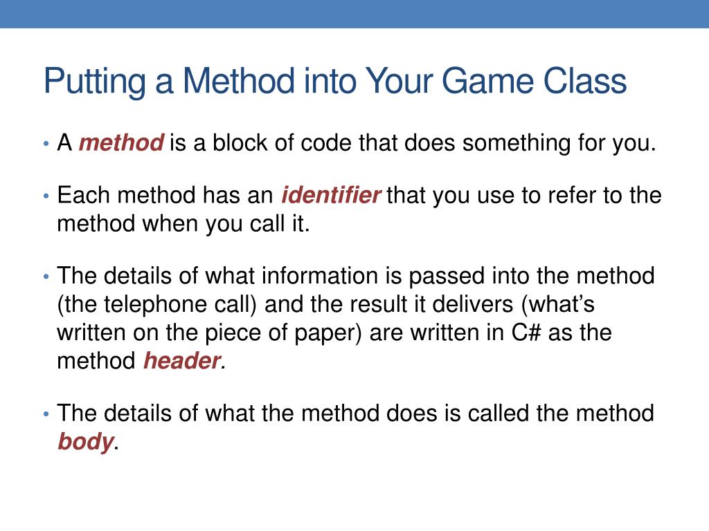 Putting a Method into Your Game Class • A method is a block of code that does something for you. • Each method has an identifierthat you use to refer to the method when you call it. • The details of what information is passed into the method (the telephone call) and the result it delivers (what’s written on the piece of paper) are written in C# as the method header. • The details of what the method does is called the method body.