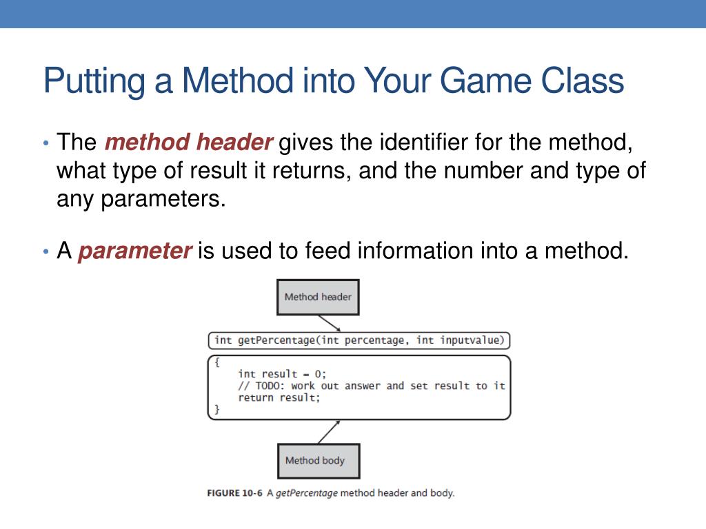 Putting a Method into Your Game Class • The methodheadergives the identifier for the method, what type of result it returns, and the number and type of any parameters. • A parameteris used to feed information into a method.