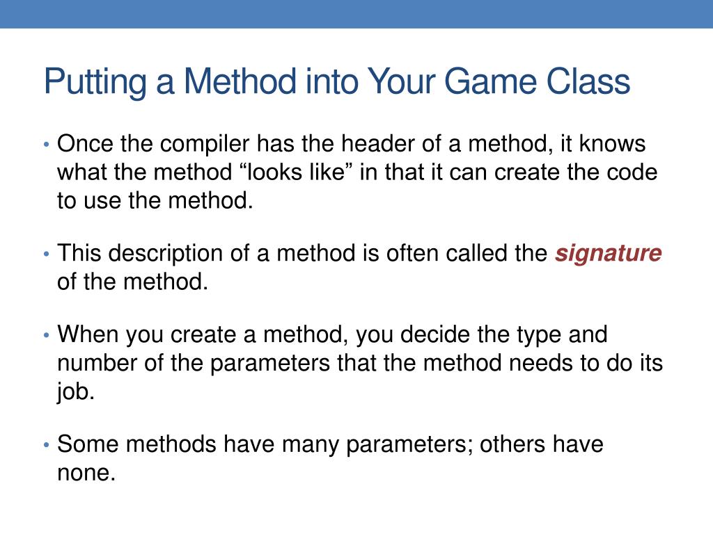 Putting a Method into Your Game Class • Once the compiler has the header of a method, it knows what the method “looks like” in that it can create the code to use the method. • This description of a method is often called the signatureof the method. • When you create a method, you decide the type and number of the parameters that the method needs to do its job. • Some methods have many parameters; others have none.