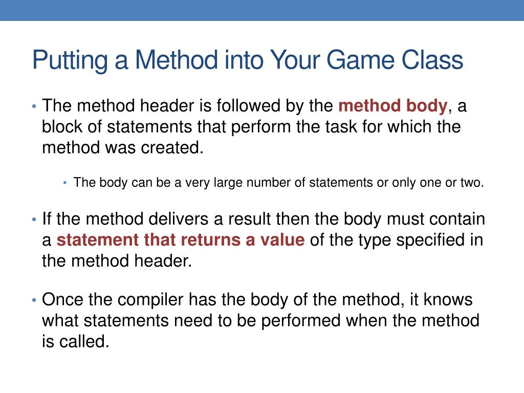 Putting a Method into Your Game Class • The method header is followed by the method body, a block of statements that perform the task for which the method was created. • The body can be a very large number of statements or only one or two. • If the method delivers a result then the body must contain a statement that returns a value of the type specified in the method header. • Once the compiler has the body of the method, it knows what statements need to be performed when the method is called.