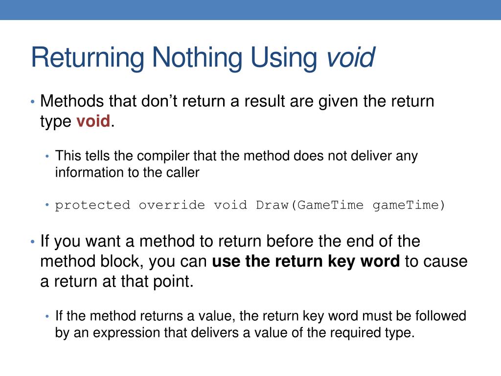 Returning Nothing Using void • Methods that don’t return a result are given the return type void. • This tells the compiler that the method does not deliver any information to the caller • protected override void Draw(GameTimegameTime) • If you want a method to return before the end of the method block, you can use the return key word to cause a return at that point. • If the method returns a value, the return key word must be followed by an expression that delivers a value of the required type.