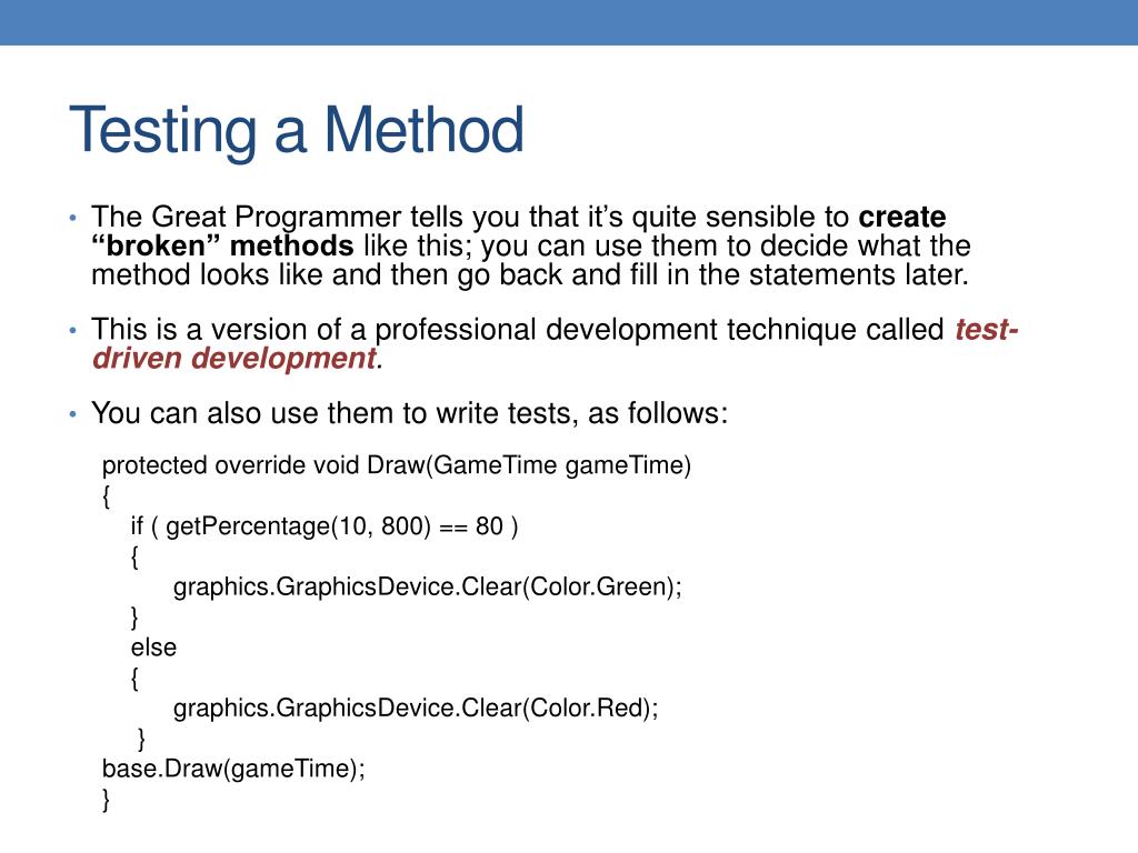 Testing a Method • The Great Programmer tells you that it’s quite sensible to create “broken” methods like this; you can use them to decide what the method looks like and then go back and fill in the statements later. • This is a version of a professional development technique called test-driven development. • You can also use them to write tests, as follows: protected override void Draw(GameTimegameTime) { if ( getPercentage(10, 800) == 80 ) { graphics.GraphicsDevice.Clear(Color.Green); } else { graphics.GraphicsDevice.Clear(Color.Red); } base.Draw(gameTime); }